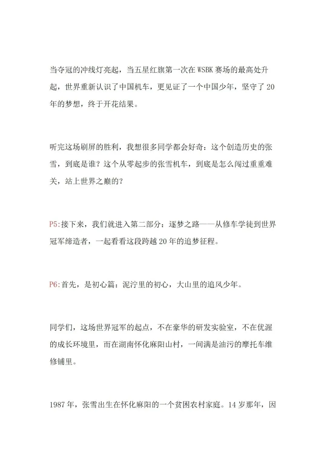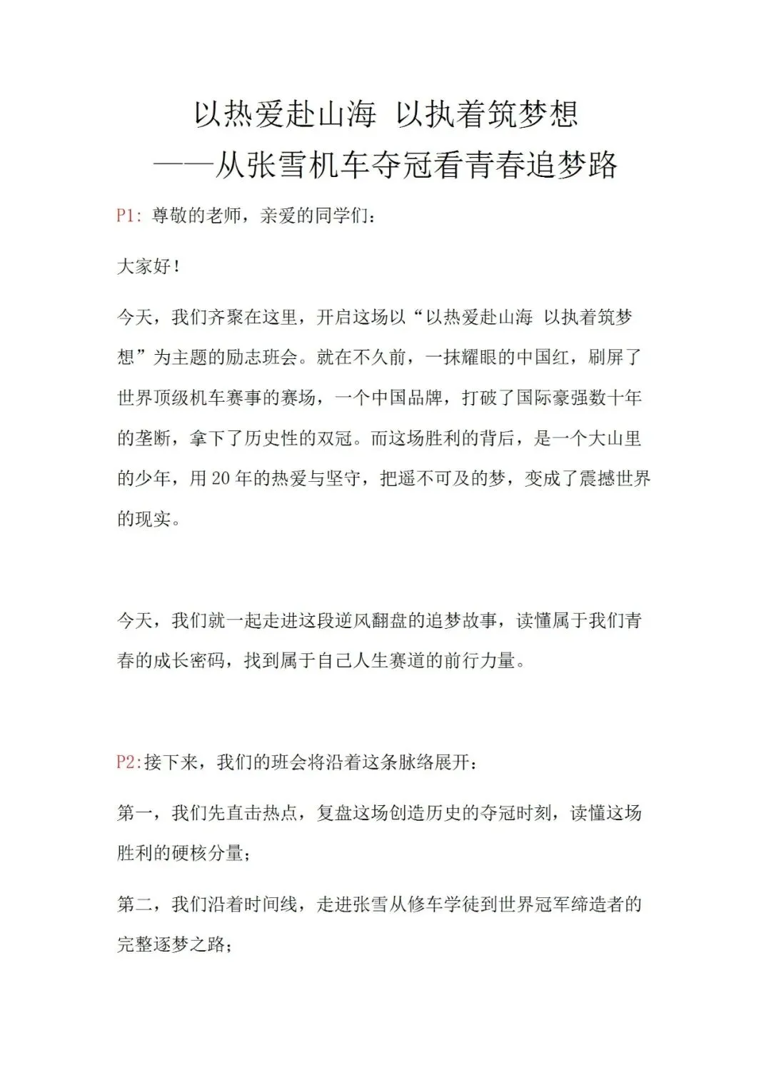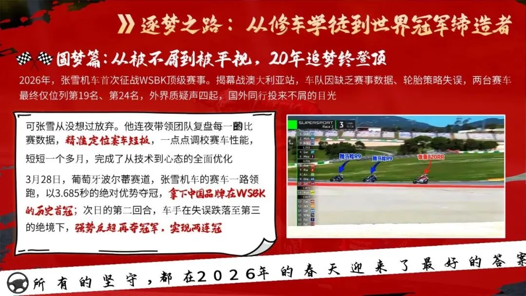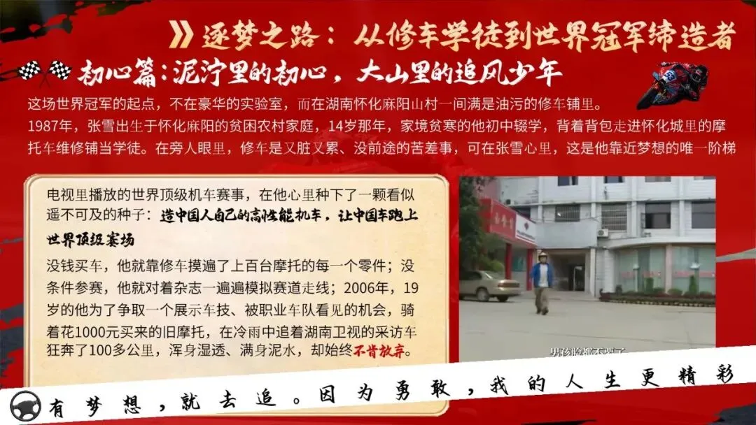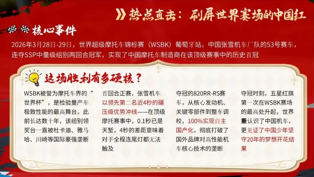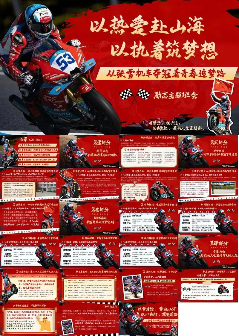 🏍️ 班会核心设计✅ 热点直击:WSBK夺冠有多硬核?✅ 逐梦之路:从修车学徒到冠军缔造者✅ 5大追梦密码:热爱、敢为、坚持、抗挫、家国