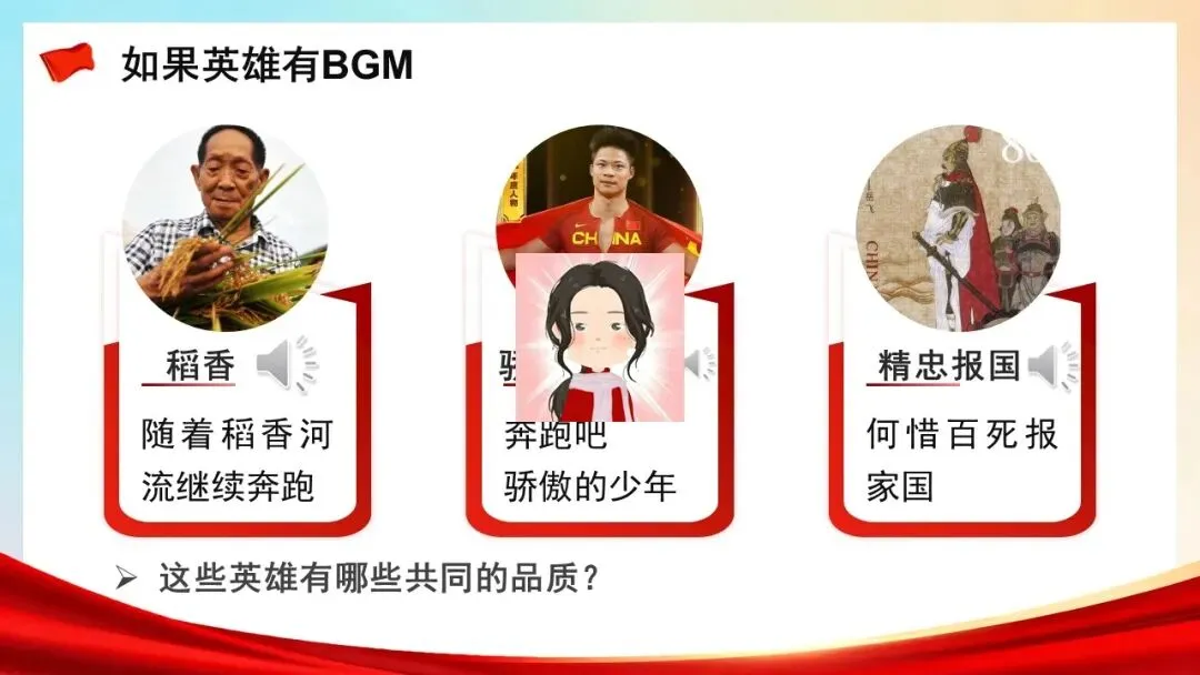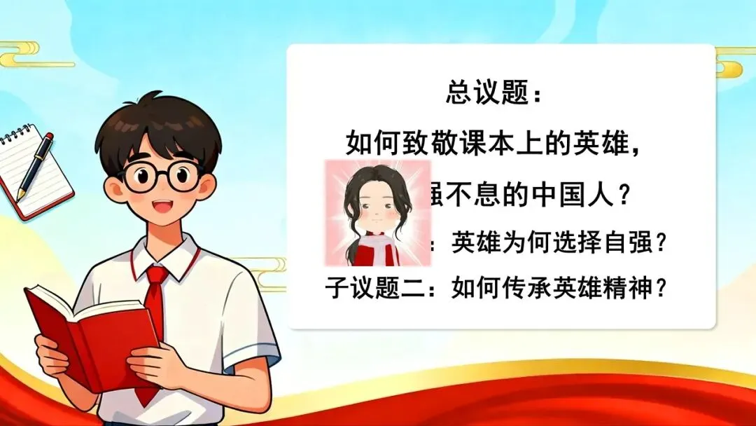 (一)导入新课。播放歌曲片段:《稻香》《骄傲的少年》《精忠报国》。提问:这些 BGM 背后的英雄,有哪些共同品质?引出课题:做自强不息的中国人。(二)新课讲授。子议题一:英雄为何选择自强?子议题二:如何传承英雄精神?