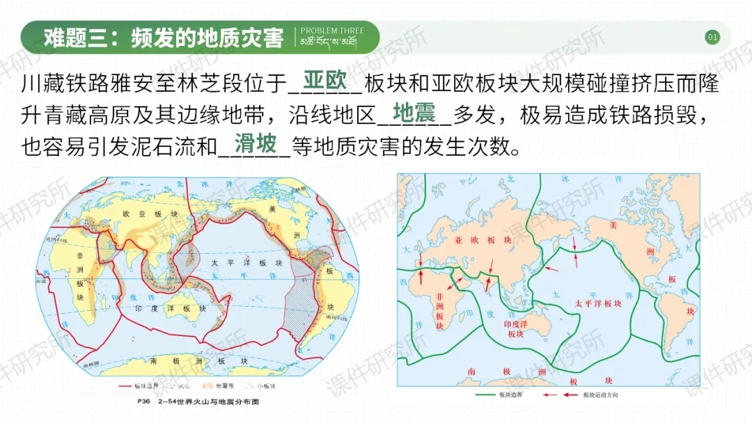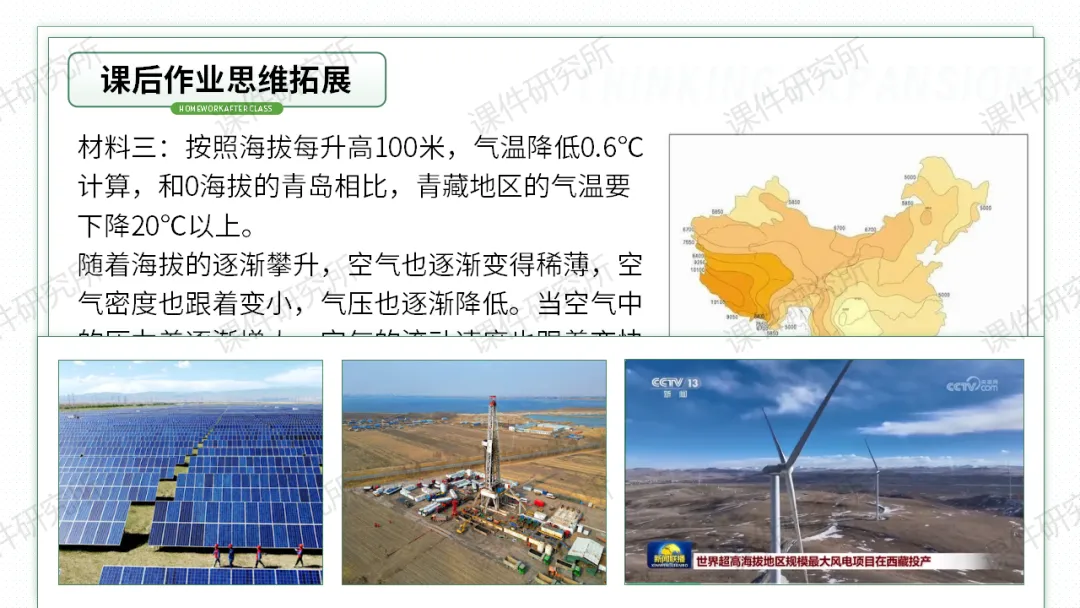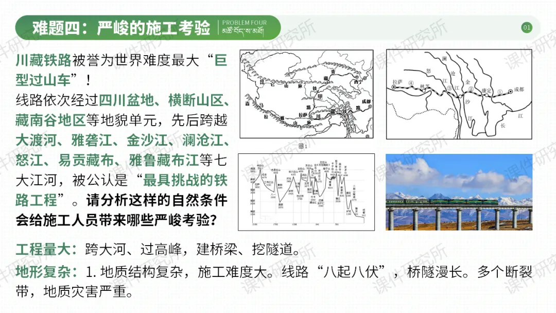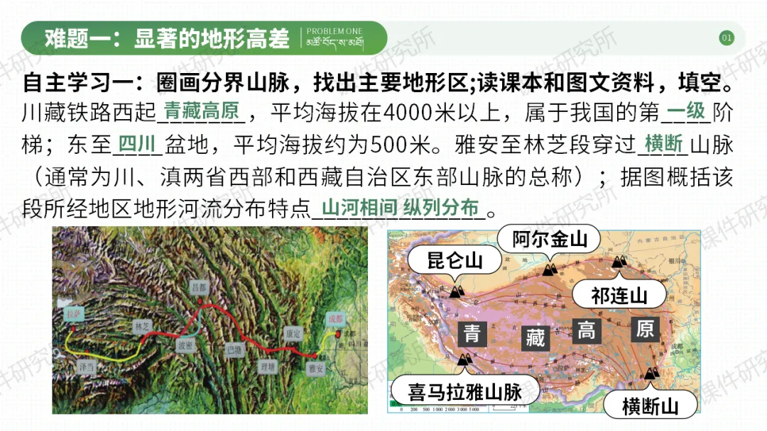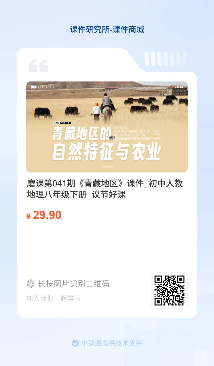 今天分享的是第41期磨课课件《青藏地区的自然特征与农业》,课件以川藏铁路为切入点,探究青藏高寒的自然特征,再延伸至高原农业和民俗,分析自然环境对生产生活的影响。设计自主、合作探究活动,搭配习题巩固,兼顾知识传授与能力培养,渗透人地协调观和爱国情怀。