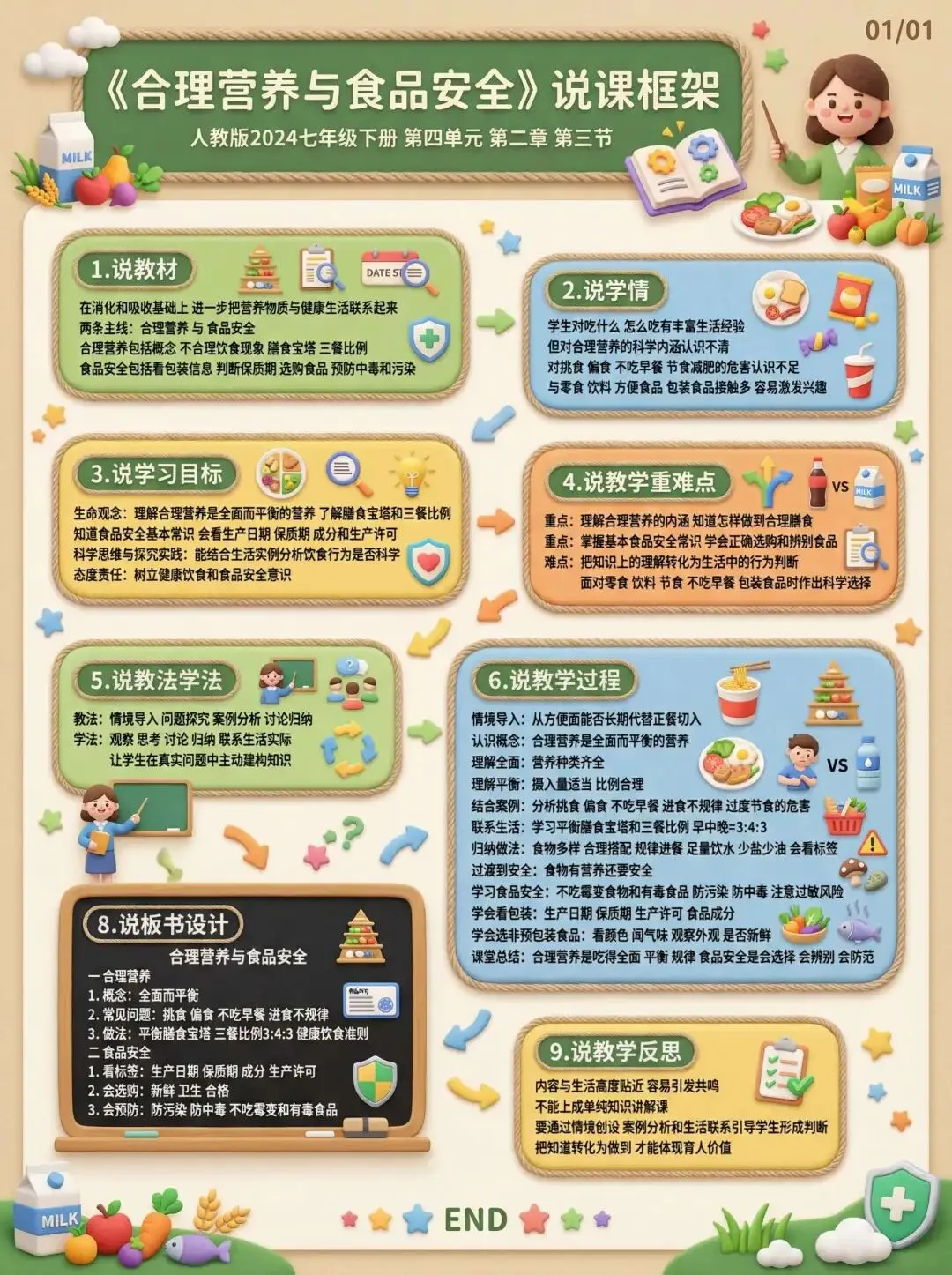 各位老师,大家好。今天我说课的内容是人教版2024七年级下册第四单元第二章第三节《合理营养与食品安全》。这一节内容紧密联系学生的日常生活,既有生物学知识的学习,也有健康生活方式的引导,具有很强的实践性和教育性。下面我将从说教材、说学情、说教学目标、说教学重难点、说教法学法、说教学过程、说板书设计和说教学反思八个方面展开我的说课。
