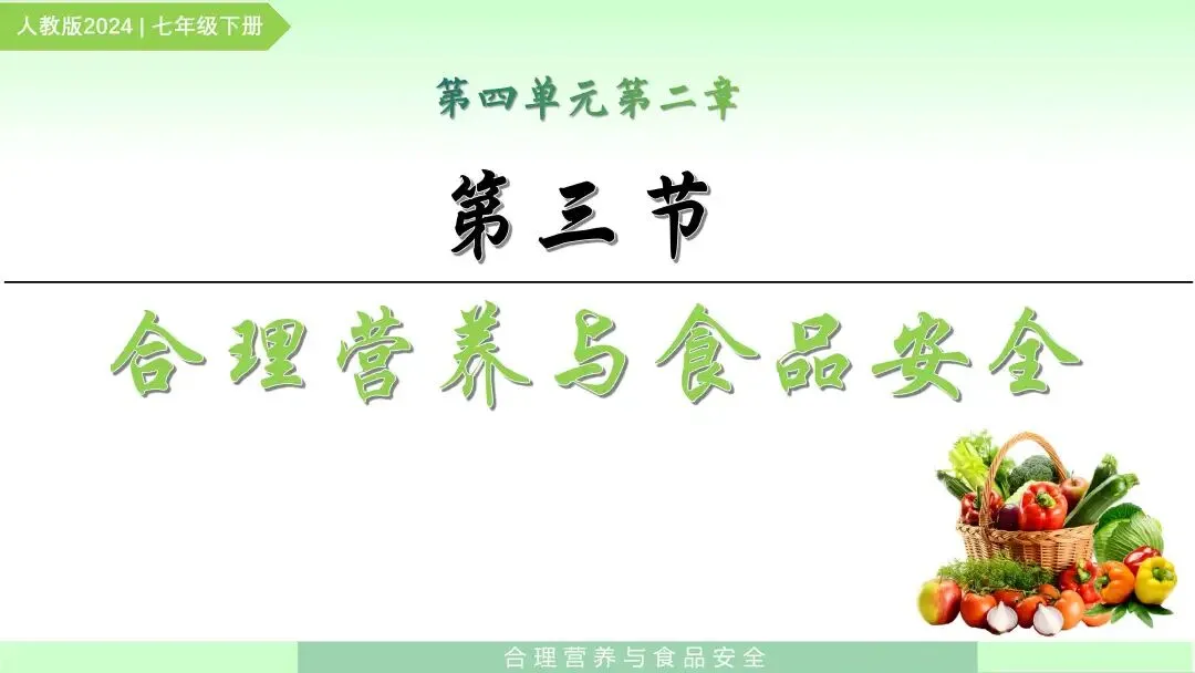 各位友友们,大家久等啦“我课小研”终于带着新一期内容回来啦。这一次和大家分享的是人教版2024七年级下册第四单元第二章第三节《合理营养与食品安全》相关课件内容。