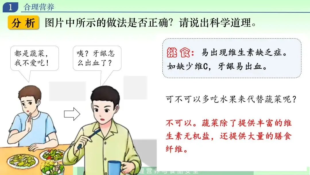 首先是挑食。课件中展示了学生不爱吃蔬菜,结果出现牙龈出血的情境。我会让学生讨论:这种做法对吗?为什么?学生在讨论后能够认识到,挑食容易导致维生素缺乏,例如缺乏维生素C可能引起牙龈出血。同时我还会追问:水果能不能完全代替蔬菜?让学生进一步理解蔬菜除了提供维生素和无机盐,还能提供大量膳食纤维,因此不能简单替代。