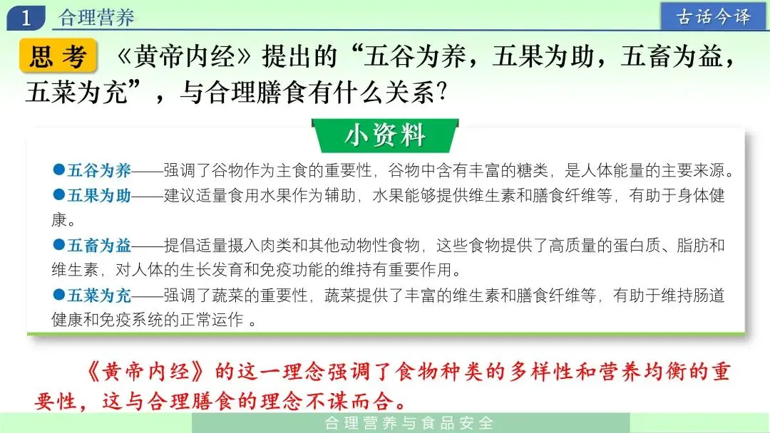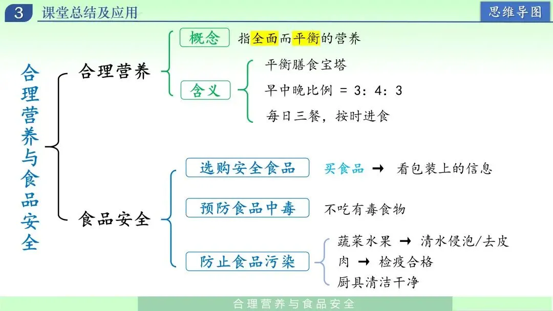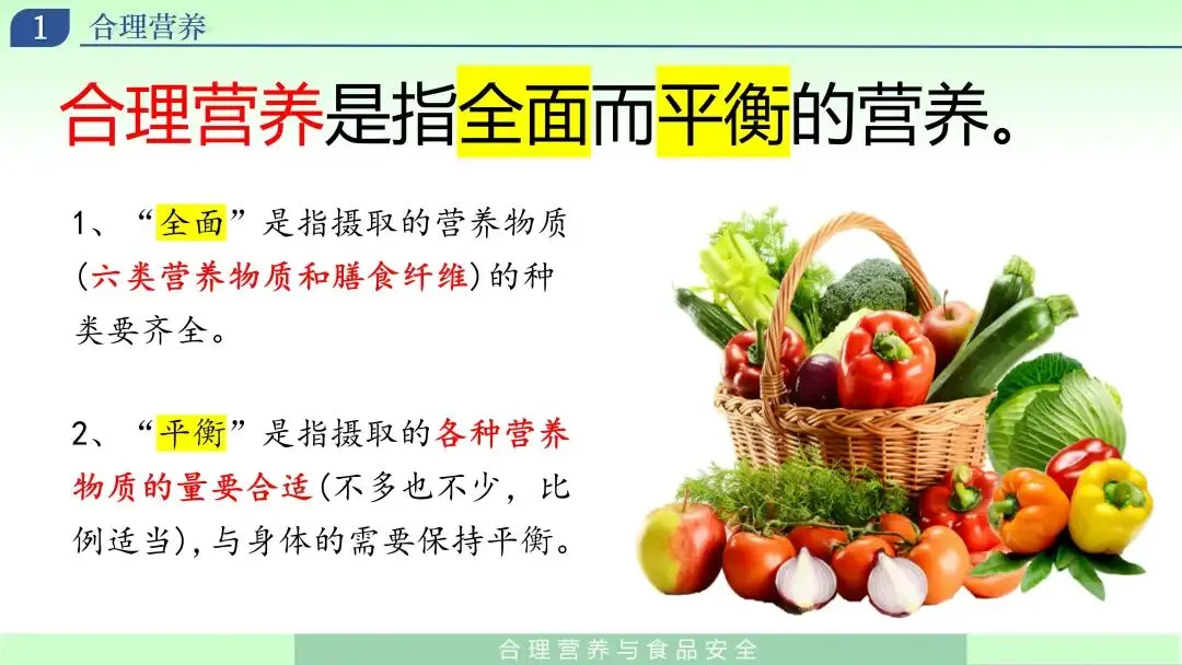 第一个重点是理解合理营养的内涵,知道合理营养是“全面而平衡的营养”,并能将这一概念落实到具体的饮食行为中。第二个重点是掌握基本的食品安全常识,学会在日常生活中正确选购和辨别食品。