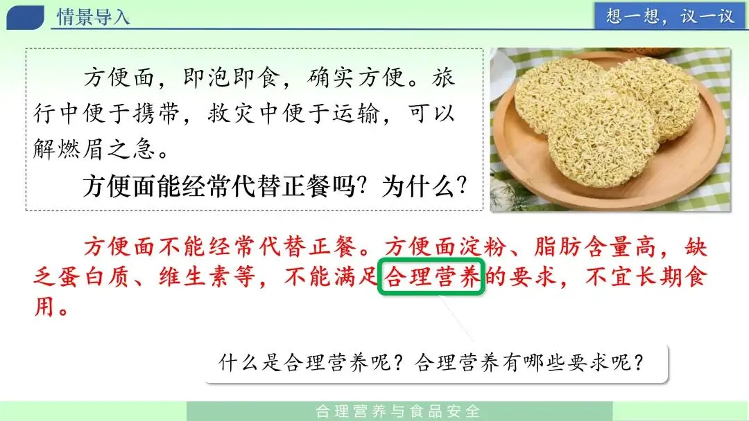 教师可从“方便面能否经常代替正餐”这一问题切入,引导学生结合生活经验发表看法。随后追问:“为什么方便面不能长期代替正餐?”自然引出“什么是合理营养”这一核心问题,从而导入新课。
