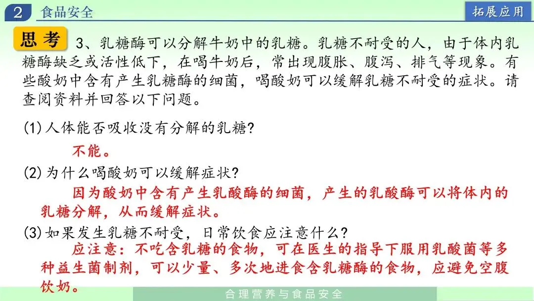 教师可顺势提问:“食物只要有营养就够了吗?”引导学生认识到,吃得健康不仅要讲究营养,还要重视安全。由此过渡到“食品安全”板块。