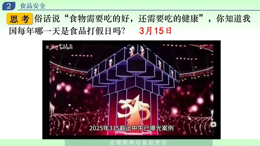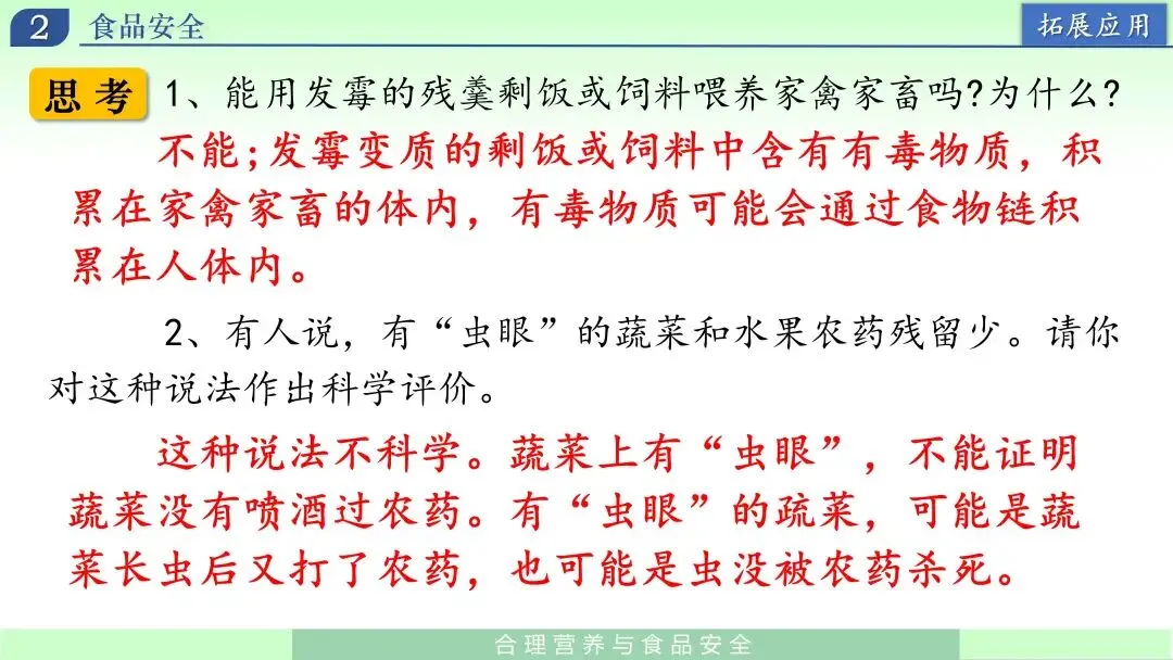 在完成合理营养部分的学习之后,我会顺势提出一个过渡问题:“吃得合理就够了吗?食物还要注意什么?”学生会很自然地想到,还要安全。于是,我进入本节课的第二部分——食品安全。