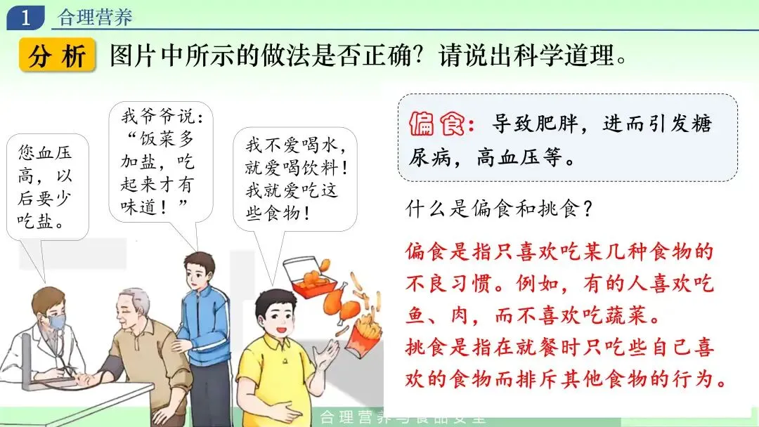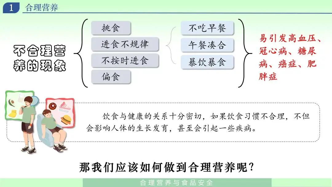 最后是偏食。通过高盐、高糖、饮料代替饮水、只吃某些食物等案例,让学生理解偏食会导致营养失衡,甚至引发肥胖、高血压、糖尿病等问题。这样,学生就能从多个真实情境中逐步形成对“合理营养”的完整理解。
