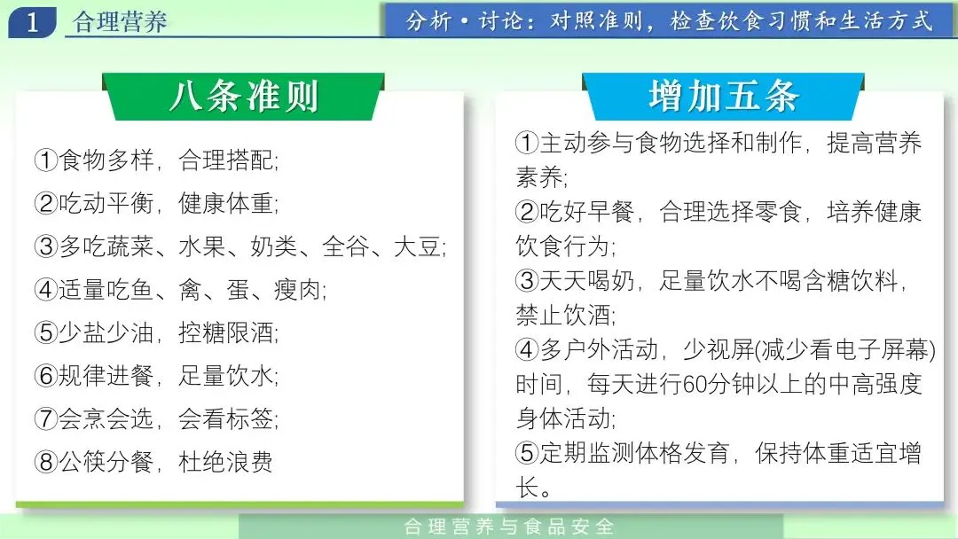 接下来,我会组织学生阅读并归纳课件中的“八条准则”和“增加五条”,例如食物多样、吃动平衡、多吃蔬果奶豆、少盐少油、规律进餐、足量饮水、会看标签、多户外活动等。通过这一环节,让学生把抽象的合理营养要求具体化、行为化。
