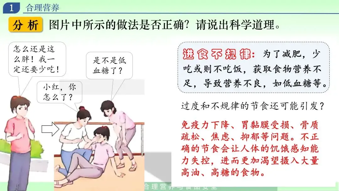 其次是进食不规律和过度节食。课件通过减肥少吃甚至不吃饭导致低血糖的案例,引导学生认识到进食不规律会导致营养不足,严重时还可能引发免疫力下降、胃黏膜受损等问题。我会借此帮助学生树立正确的健康观,告诉他们真正健康的体重管理不是盲目节食,而是规律饮食和适量运动。