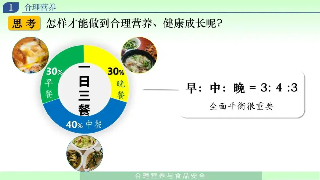 然后,我会结合课件中的一日三餐比例图,帮助学生认识早、中、晚三餐的合理分配比例为3:4:3,进一步强化“规律进餐、全面平衡”的观念。