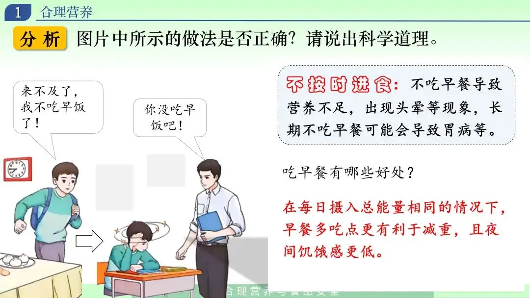 接着是不按时进食,也就是不吃早餐。课件中用学生没吃早饭导致头晕的情境进行说明。我会让学生结合自己的生活经验谈一谈感受,再总结:不吃早餐会导致营养不足,长期如此还可能影响身体健康。再结合课件中的内容,帮助学生认识早餐的重要性以及一日三餐合理分配的必要性。