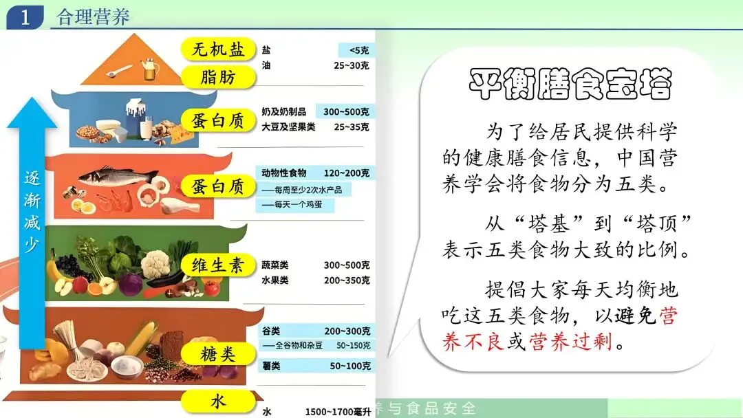 通过阅读课件内容,学生能够得出:合理营养是指全面而平衡的营养。“全面”是指摄取的营养物质种类要齐全,包括六类营养物质和膳食纤维;“平衡”是指各种营养物质摄取的量要合适,比例要适当,并与身体的需要保持平衡。这里我会引导学生结合前面学过的知识进行回顾,让学生明白合理营养不是“吃得越多越好”,而是“吃得科学、吃得恰当”。