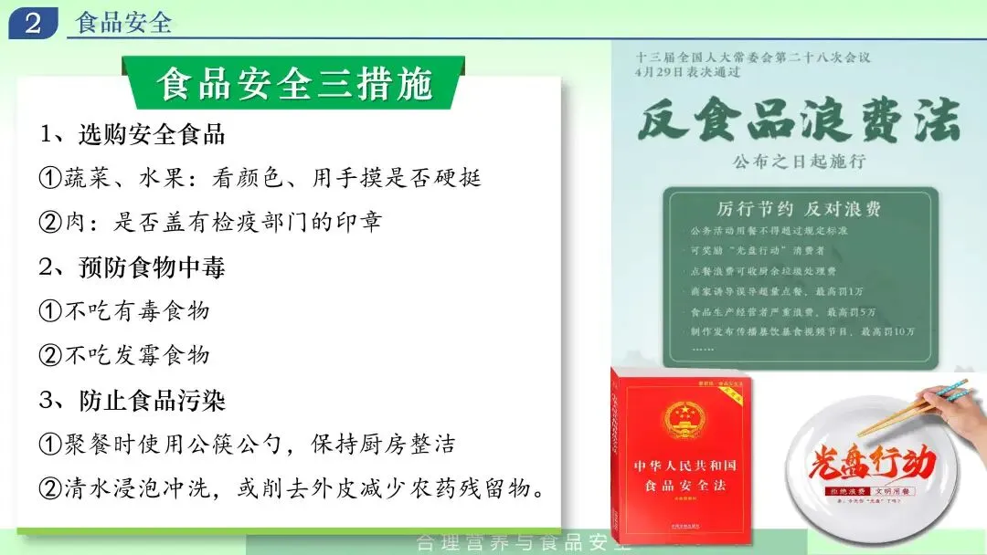 树立健康饮食和食品安全意识,养成规律进餐、合理搭配、关注食品标签的良好习惯,增强珍爱生命、关注健康的责任意识。