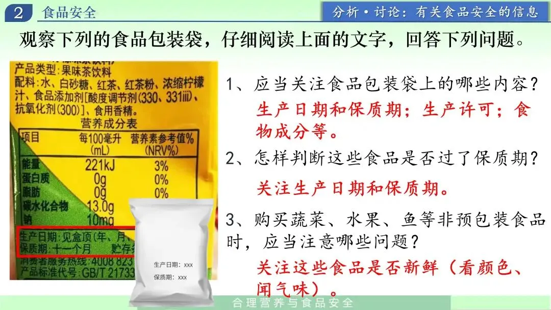 通过阅读和讨论,学生能够得出:购买包装食品时,应关注生产日期、保质期、生产许可、食品成分等信息;判断是否过期要结合生产日期和保质期;购买蔬菜、水果、鱼等非预包装食品时,则要注意是否新鲜,可以通过看颜色、闻气味等方式进行初步判断。