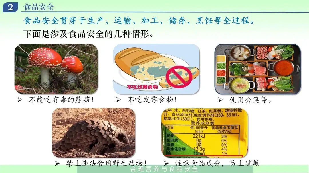 我会先引导学生认识到,食品安全贯穿于生产、运输、加工、储存和烹饪等全过程。接着,结合课件内容,带领学生了解几种常见的食品安全情形,例如不能吃有毒蘑菇、不吃发霉食物、禁止违法食用野生动物、聚餐时使用公筷、注意食品成分防止过敏等。通过这些生活化的内容,帮助学生建立基本的食品安全意识。