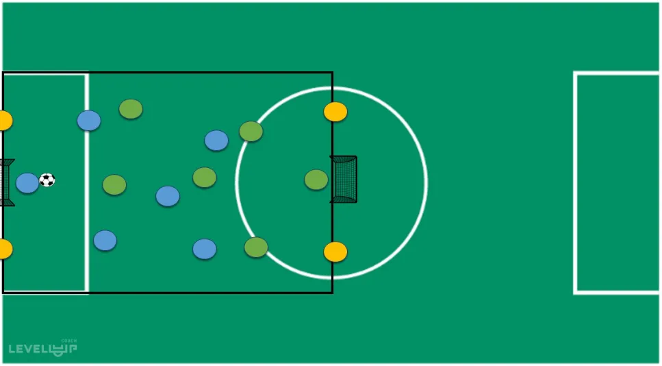 很多队员缺乏前插进攻的意识,经常出现将球传给纵深支点球员后只会停留在后侧接应,没有前插继续做配合的意识。这套 6vs6+4 小场比赛,核心就在于训练西班牙教练极其重视的 “第三人配合”(Tercer hombre)。它不是简单多传一脚,而是通过门线中立球员做墙,其他队员(第三人)前插接应,把原本被封死的进攻线路重新打开,让终结在正确的时间、正确的角度发生。