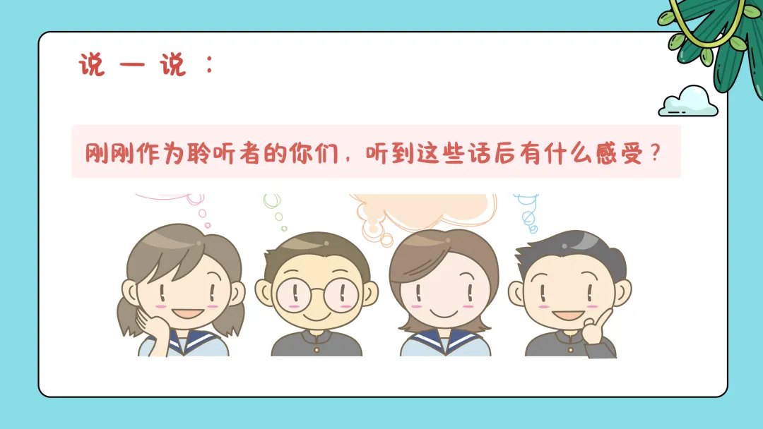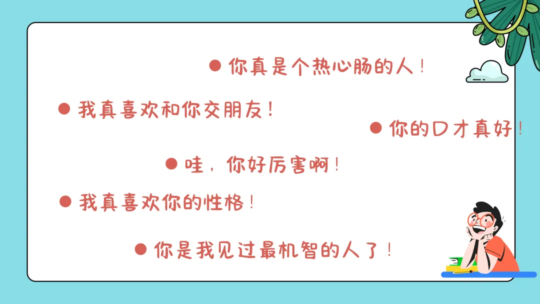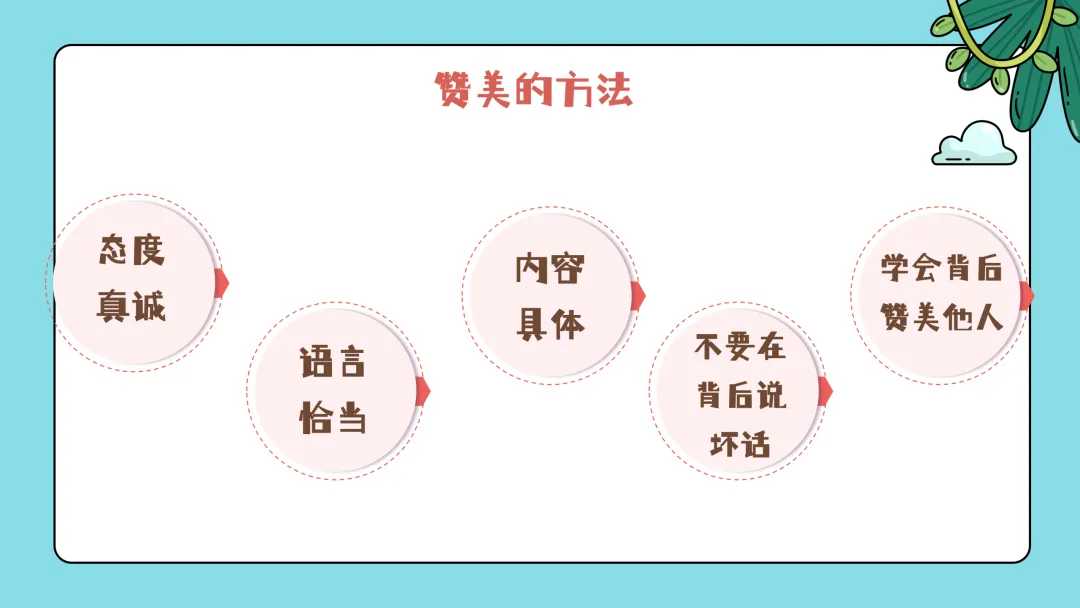 刚刚我们感受到了赞美所带给我们的快乐,接下来那如何把这种快乐带给朋友们呢?对的,就是学会赞美他人,但是赞美的正确方法有哪些,你们知道吗?