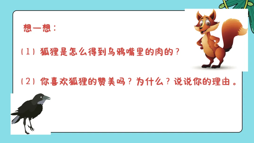 那同学们你们喜欢狐狸的赞美吗?嗯,大家都说不喜欢,为什么呀,是不是因为它的赞美并不是真诚的,只是为了吃到乌鸦嘴里的肉,相信乌鸦以后再也不愿意和狐狸当朋友了对不对?