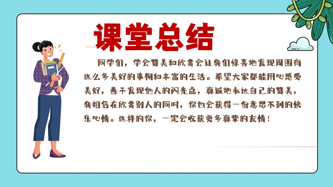 同学们,学会赞美和欣赏会让我们惊喜地发现周围有这么多美好的事物和丰富的生活。希望大家都能用心感受美好,善于发现他人的闪光点,真诚地表达自己的赞美,我相信在欣赏别人的同时,你也会获得一份意想不到的快乐心情。这样的你,一定会收获真挚的友情,也一定会成长得更快!