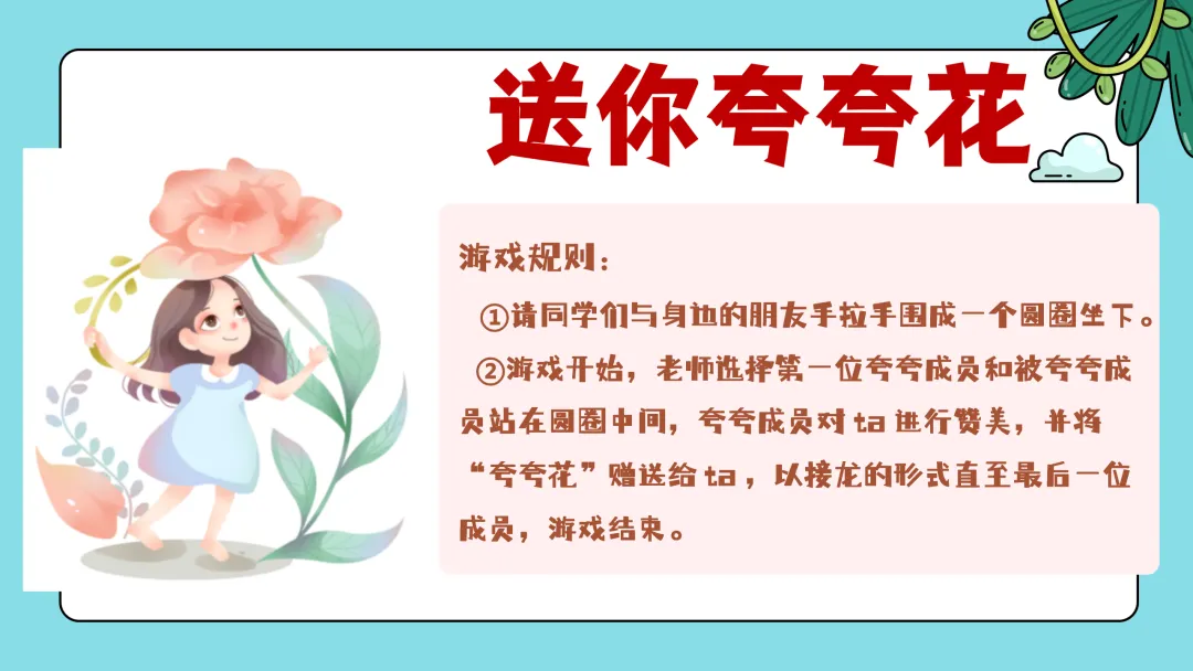 ②游戏开始,老师选择第一位夸夸成员和被夸夸成员站在圆圈中间,夸夸成员对 ta 进行赞美,并将“夸夸花”赠送给 ta ,以接龙的形式直至最后一位成员,游戏结束。