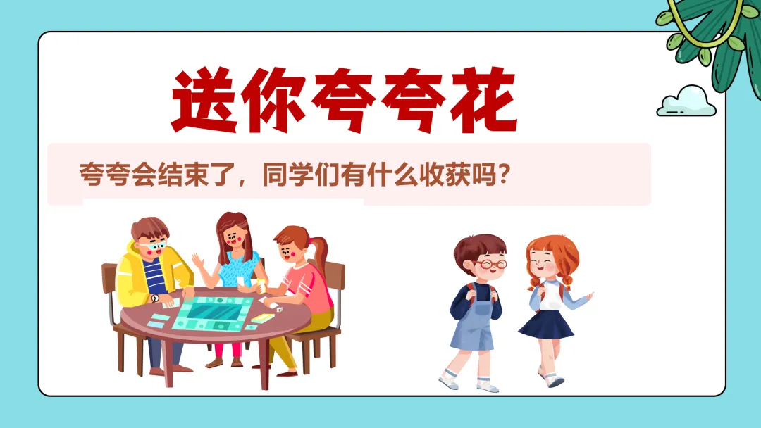 好游戏结束!请同学们回到座位,夸夸会结束,你们有什么收获吗?