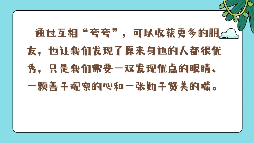嗯,说的真好,通过互相“夸夸”,可以收获更多的朋友,也让我们发现了原来身边的人都很优秀,只是我们需要一双发现优点的眼睛、一颗善于观察的心和一张勤于赞美的嘴。