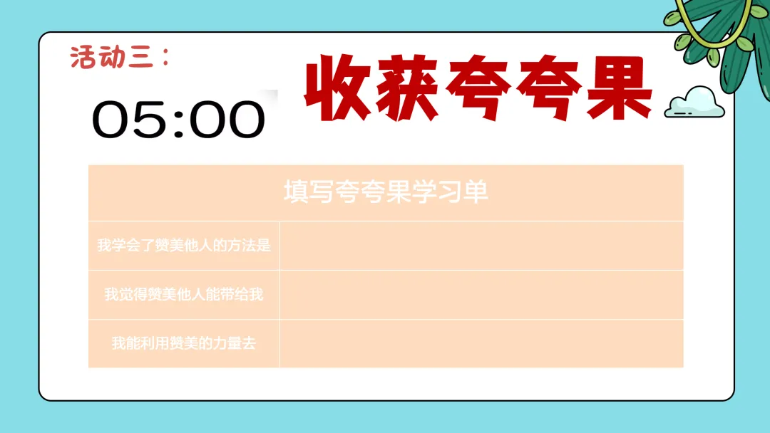 接下来请大家注意老师在课前给你们分发的夸夸单,请仔细填写,收获我们夸夸果实吧!