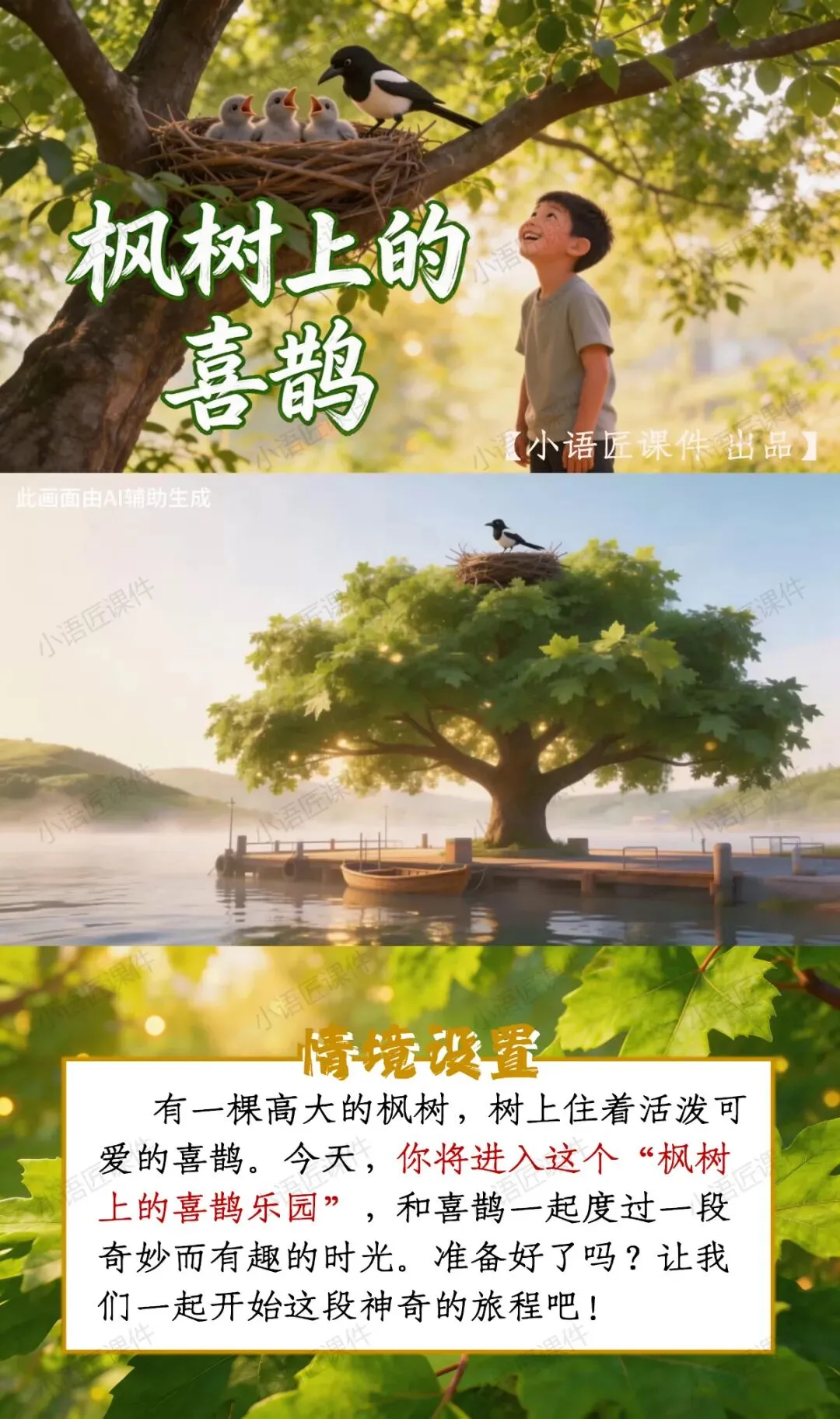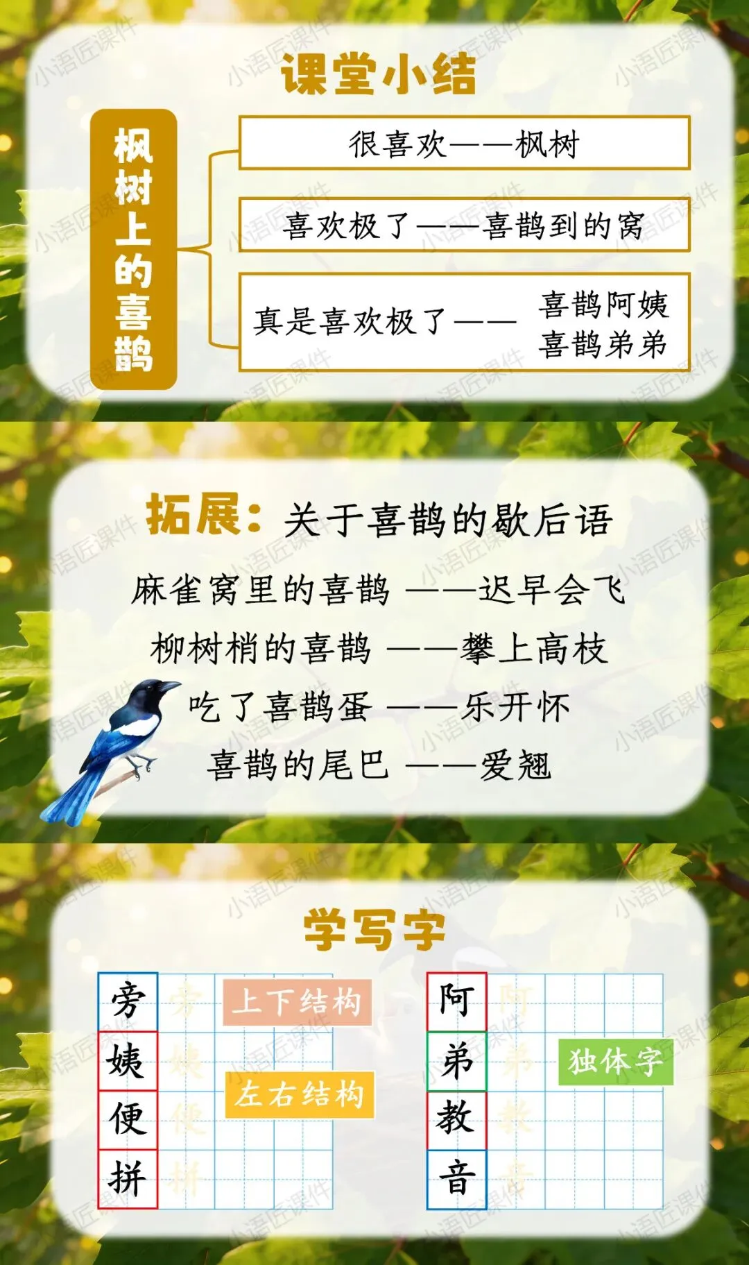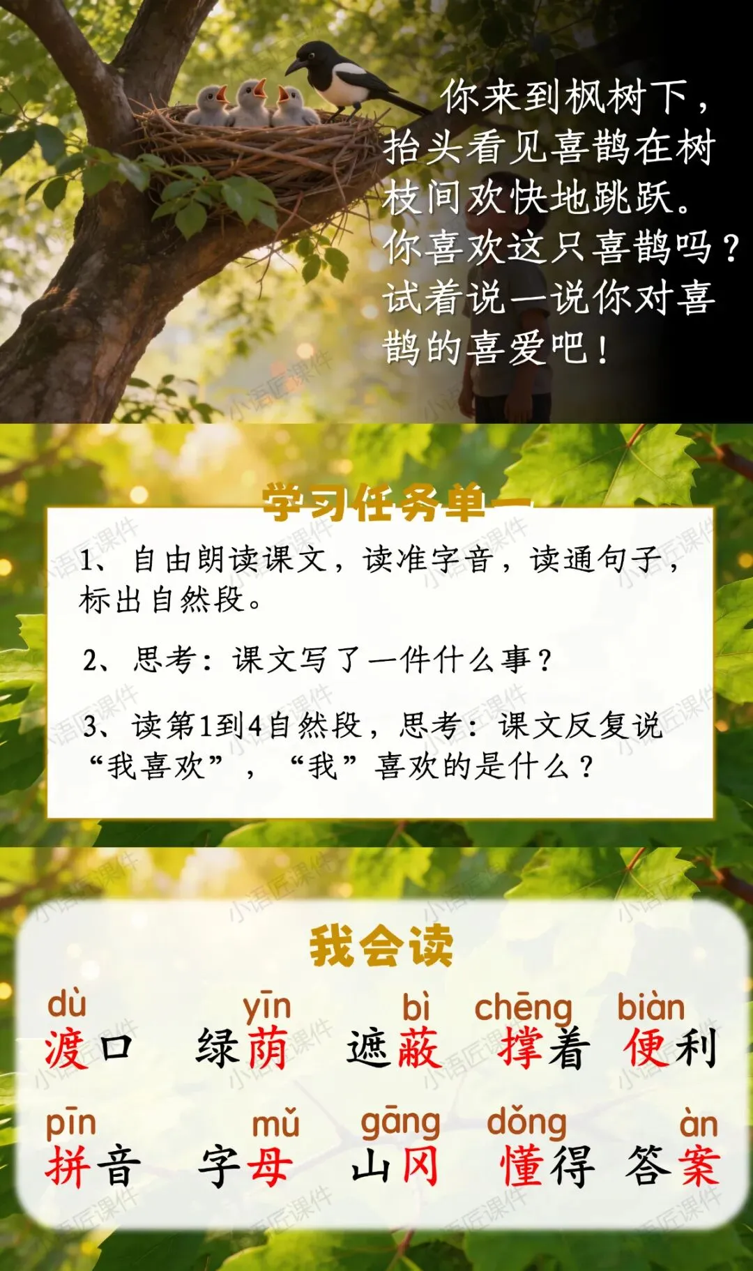 大家好,我是小语匠课件!今天给大家分享部编人教版二年级下册《枫树上的喜鹊》的独家课件。(课件获取方式见文末)