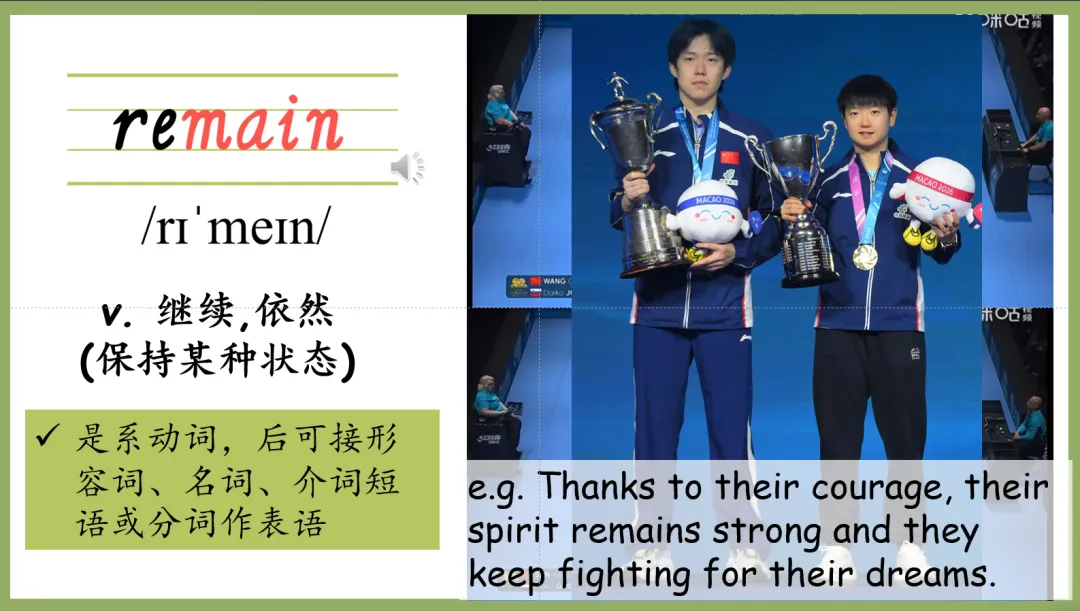 首先,是我最喜欢的两位运动员。介绍他们两个,复习了上个单元学的thanks to; courage; spirit; fight for; keep doing sth.