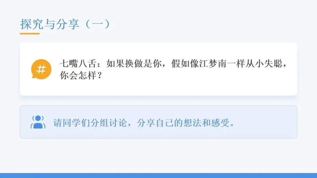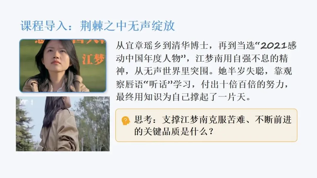 1.教师活动:播放江梦南简短事迹,提问:支撑她从无声世界走向清华博士的关键品质是什么?