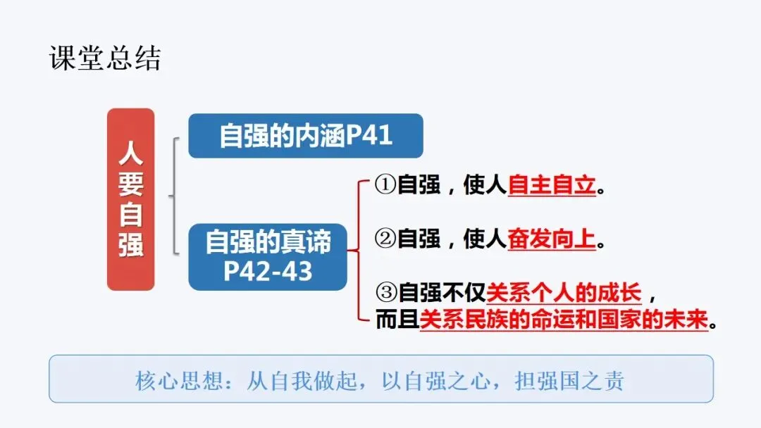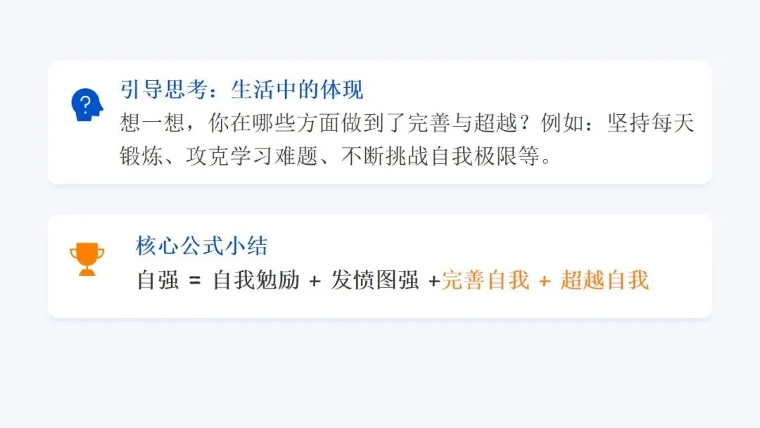 给出核心公式:自强=自我勉励+发愤图强+完善自我+超越自我。