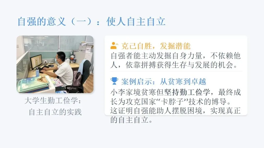 道德修养:掌握自强内涵,树立自强不息的品质。