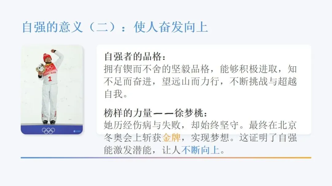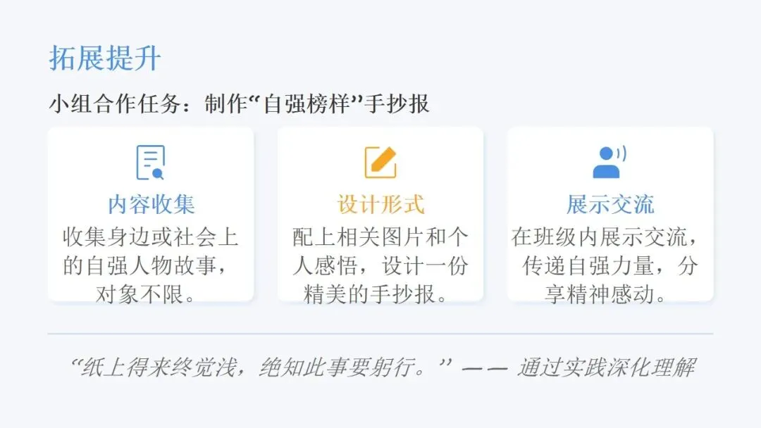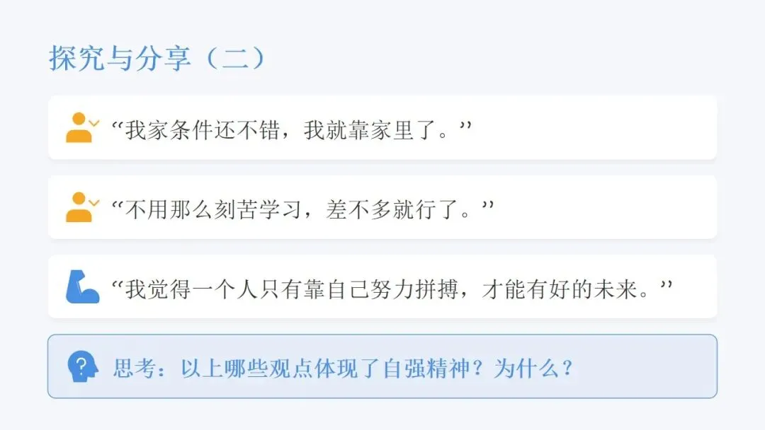 3.设计意图:小组合作,共情体验,深化对自强内涵的理解。