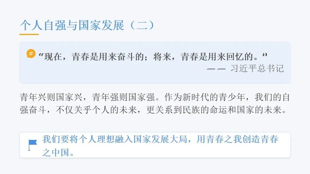 3.教师提升:引用总书记话语,强调青年强则国家强,个人自强汇聚国家力量。