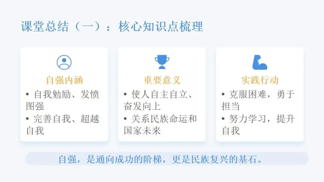 以学生为主体、情境为载体、活动为路径,通过“故事感悟—观点辨析—合作探究—讲练评结合”,落实新课标“生活化、活动化、实践化”要求,引导学生从知自强—明自强—行自强层层递进,实现知行合一。