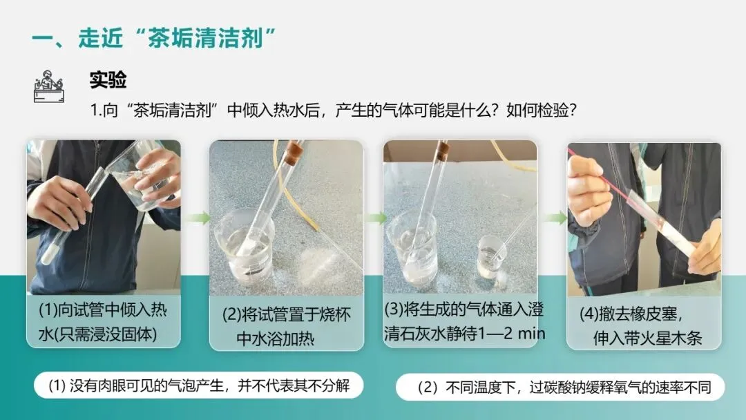 布置实验任务:“向茶垢清洁剂中加入热水,探究产生的气体是什么?” 提供实验器材(试管、烧杯、澄清石灰水、带火星木条、橡皮塞、导管),指导实验步骤:水浴加热样品、通入澄清石灰水、伸入带火星木条。