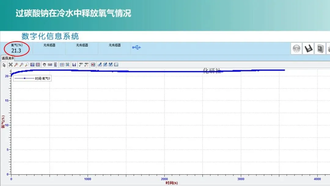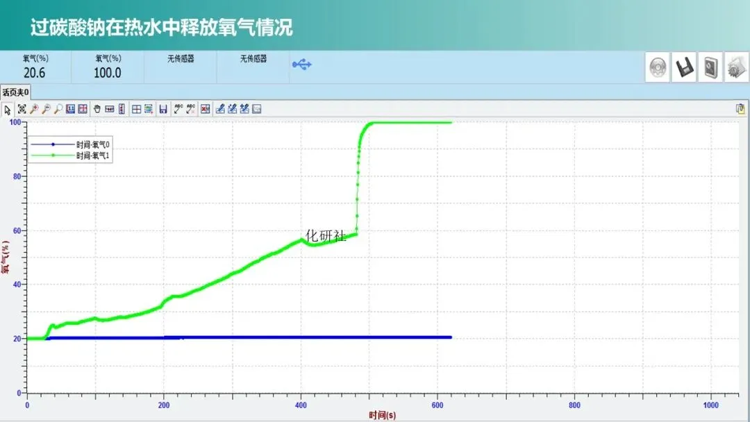 展示数字化实验数据图(冷热水中过碳酸钠释放氧气的速率曲线),提出问题:“对比冷热水中氧气释放速率,能得出什么结论?”