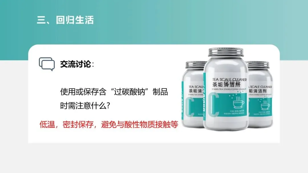 展示茶垢清洁剂的商品图片与清洁效果对比图,播放消费者使用反馈视频(含 “盖杯盖导致爆炸” 的安全事故),提出问题:“茶垢清洁剂为何能快速去除顽固污渍?使用时为何不能盖杯盖?其核心成分过碳酸钠(2Na₂CO₃・3H₂O₂)藏着怎样的化学奥秘?” 引出本节课主题:“茶垢清洁剂之趣 —— 常见的盐专题复习”。