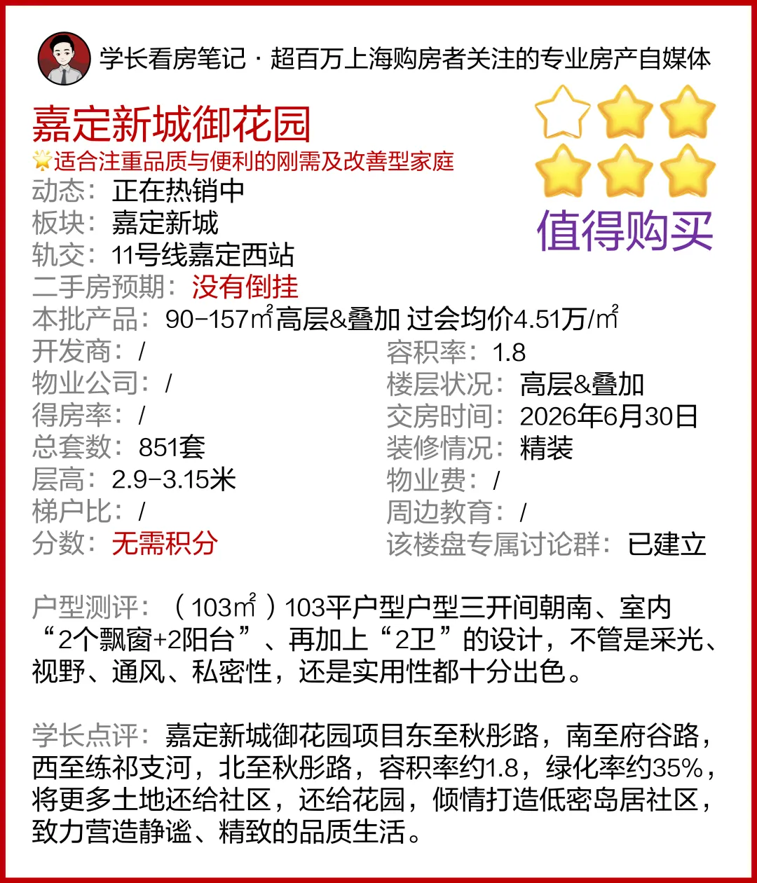 最新消息:嘉定新城「嘉定新城御花园」正在热销!推出建面约90㎡高层&157㎡叠加,过会均价45190元/㎡!