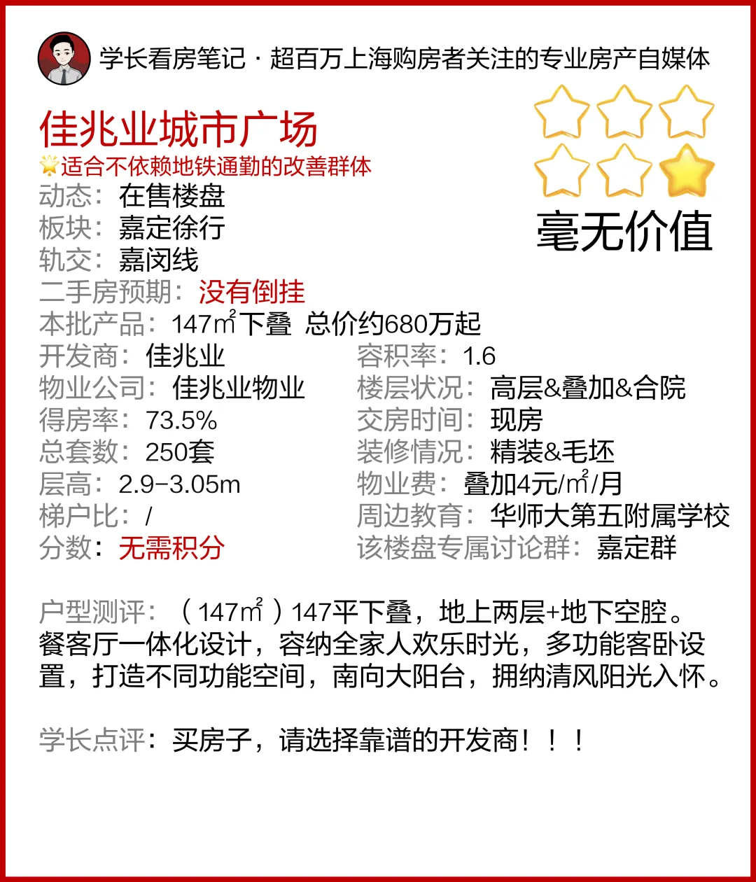 最新消息:嘉定徐行「佳兆业城市广场」正在热销中!推出建面约147㎡下叠墅,总价约680万起!