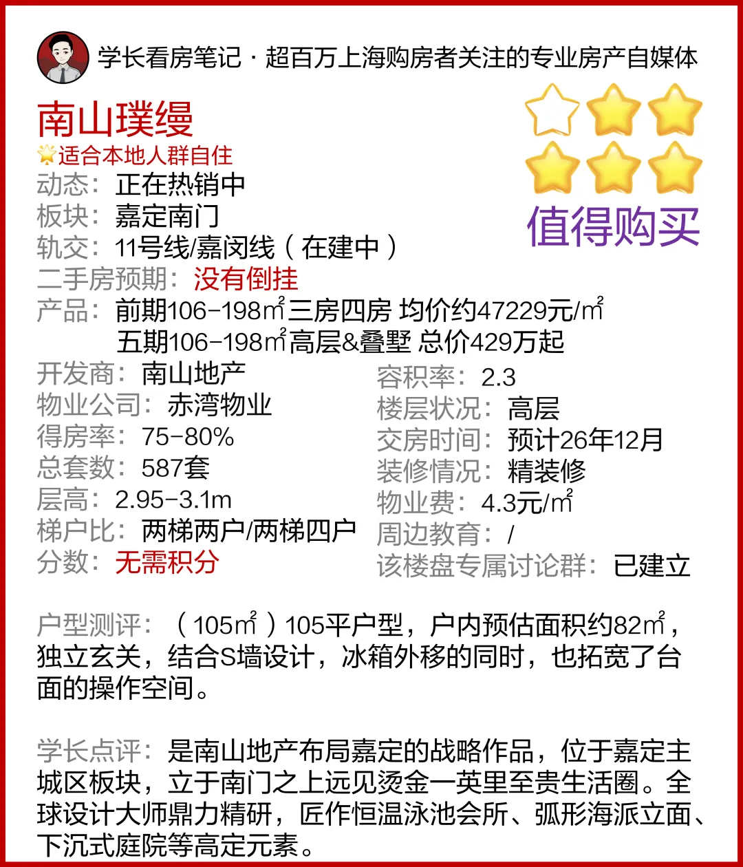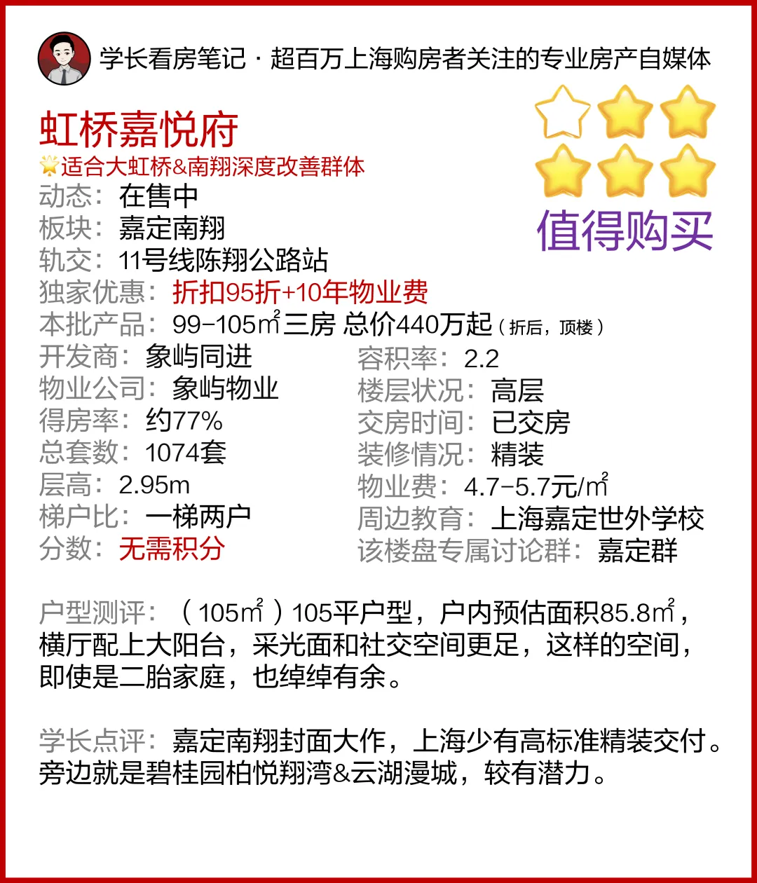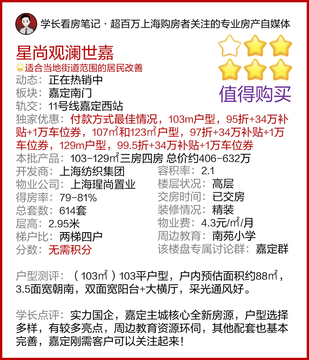 :嘉定主城「星尚观澜世嘉」正在热销中!推出建面约103-129㎡三房四房,均价约4.52万/㎡!