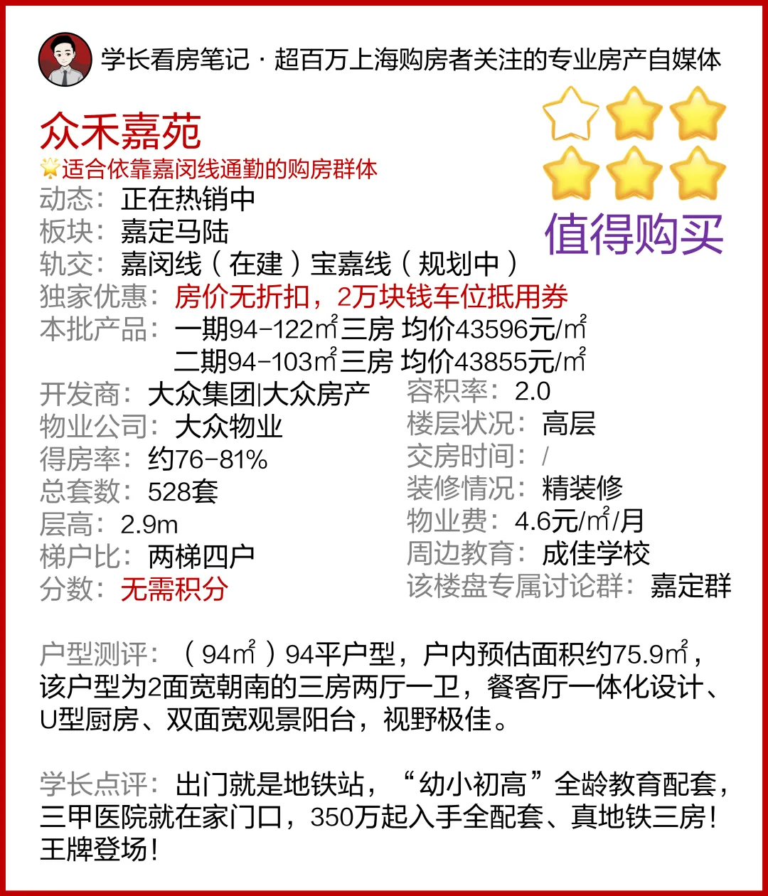 地铁“零”距离!2站南翔,刚需必看!「众禾嘉苑」正在热销中!推出建面约94-122㎡三房!