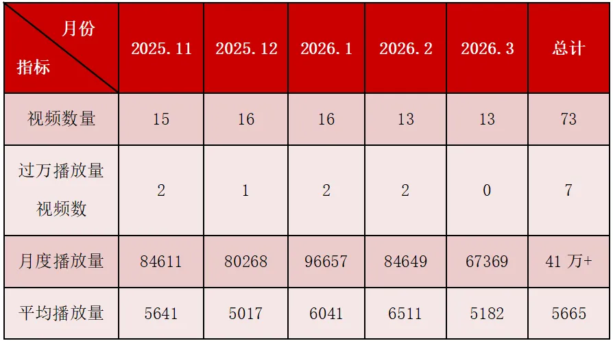 自2025年11月1日以来,数字罗塞塔计划视频号每周发布3-4个视频,不管是月度播放量还是平均播放量都基本保持稳定(3月份有一定程度的下滑,4月份争取拉上去!),比较遗憾的是总共已经发布73个视频,超过1万播放量的只有7个,至今依然没有出现爆款(10万+播放量),还需要为追求第一个属于罗塞塔的10万+作品而继续努力!