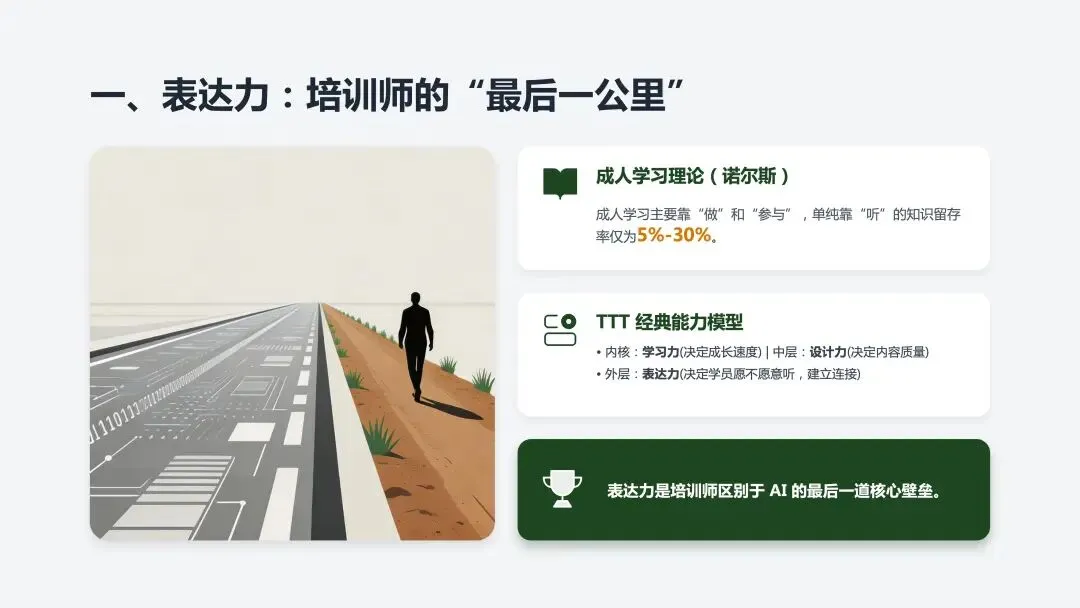 当所有人都能用AI做出专业课件,课件本身就不值钱了。培训师的核心竞争力,只剩下一个——表达力。