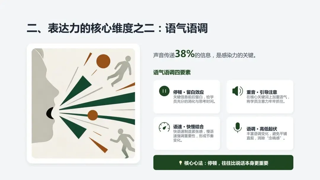 停顿 | 在关键信息前后留白 | 给学员消化时间,制造"留白效应" |