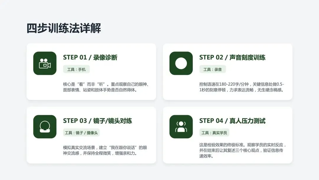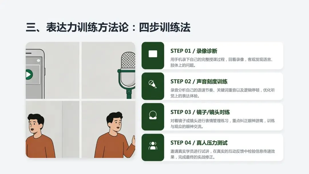 四步训练法:录像诊断→声音刻度→镜子对练→真人测试。