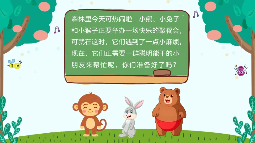 1. 教师:“小朋友们,今天森林里要举办一个快乐的聚餐会,小熊、小兔子和小猴子都来了。可是它们遇到了一点小麻烦,需要请我们小朋友来帮忙,你们愿意吗?”