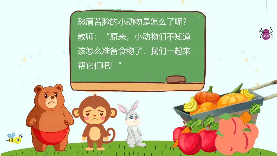 3. 教师:“原来,小动物们不知道该怎么准备食物了,我们一起来帮它们吧!”