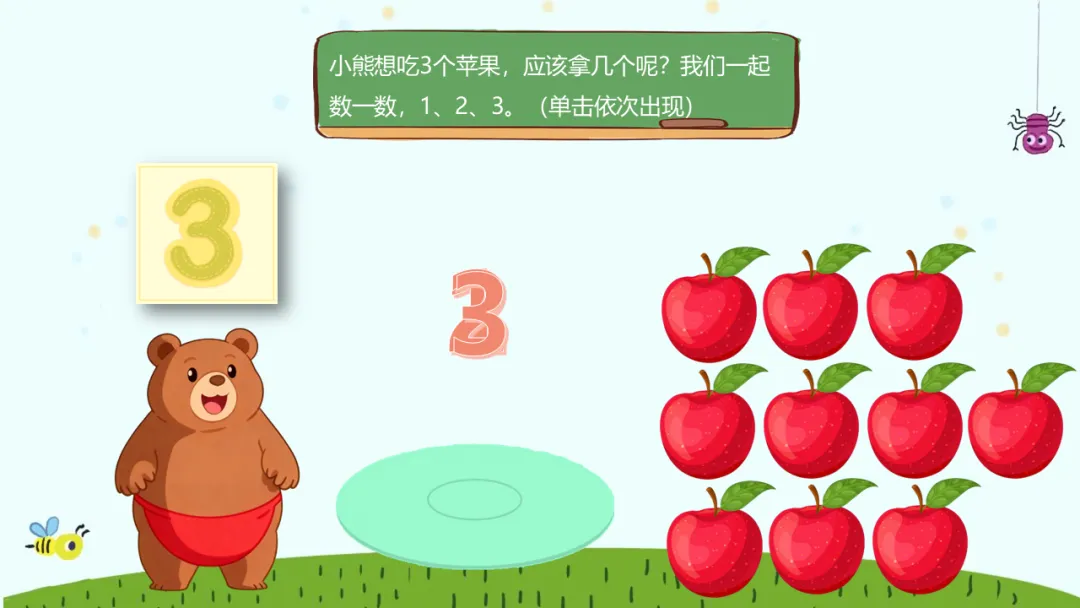课件出示小熊,旁边有数字“3”。教师:“小熊想吃3个苹果,我们应该拿几个呢?我们一起数一数,1、2、3。”