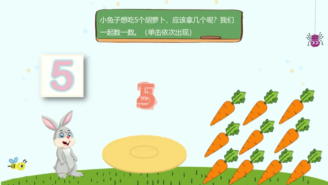 依次出示小兔子(数字5,需要胡萝卜)和小猴子(数字4,需要桃子),请个别幼儿到屏幕前操作,其他幼儿用小手一起点数验证。